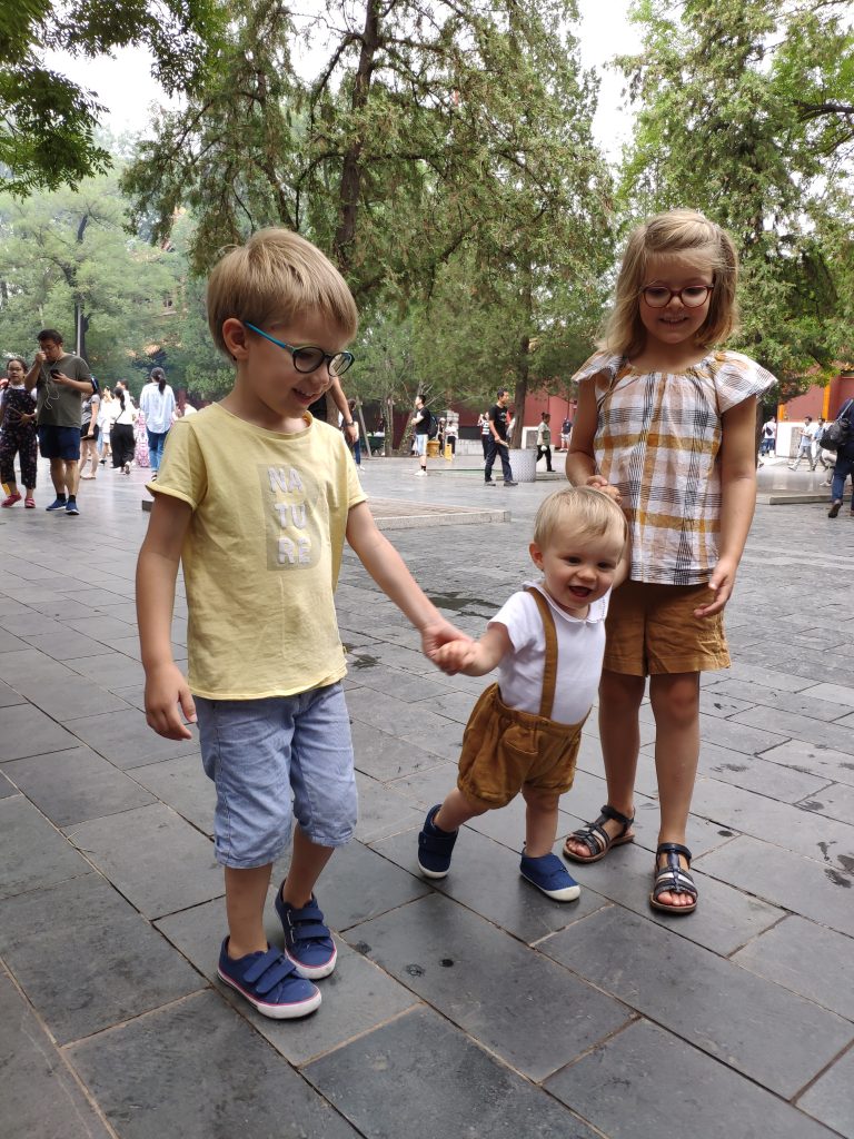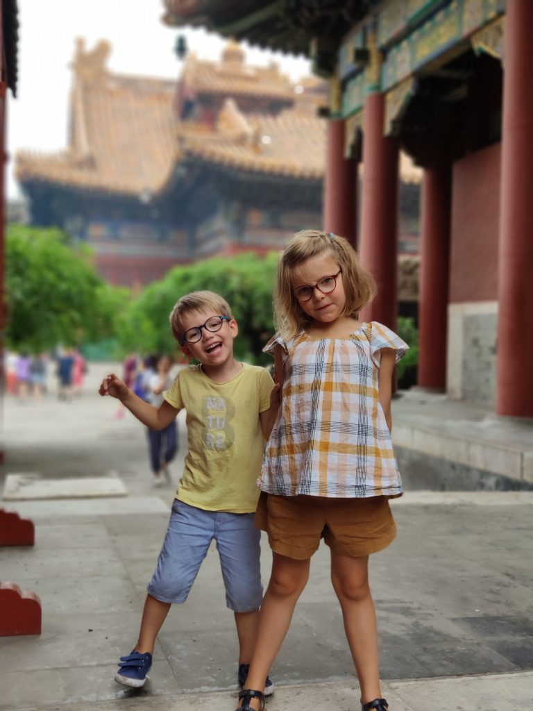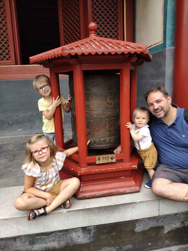 Aujourd’hui nous avons réussi à démarrer un peu plus tôt que les jours précédents : direction le Temple des Lamas. Dans le métro Auguste se fait une copine chinoise qui doit avoir à peu près son âge. C’est très marrant de voir les interactions à cet âge là sans barrière de la langue ni culture. Au Temple des Lamas beaucoup de touristes (probablement dû à l’effet samedi) se pressaient dans les différents pavillons pour se recueillir devant les statues de Bouddha. Le dernier accueille un Bouddha debout géant (entre 12 et 24m selon les guides…) Les enfants se sont amusés à faire tourner les moulins à prières. Les fidèles faisaient brûler pas mal d’encens et ça piquait les yeux. Nous sommes restés un bon moment car le site est assez grand et nous nous y sentions bien.