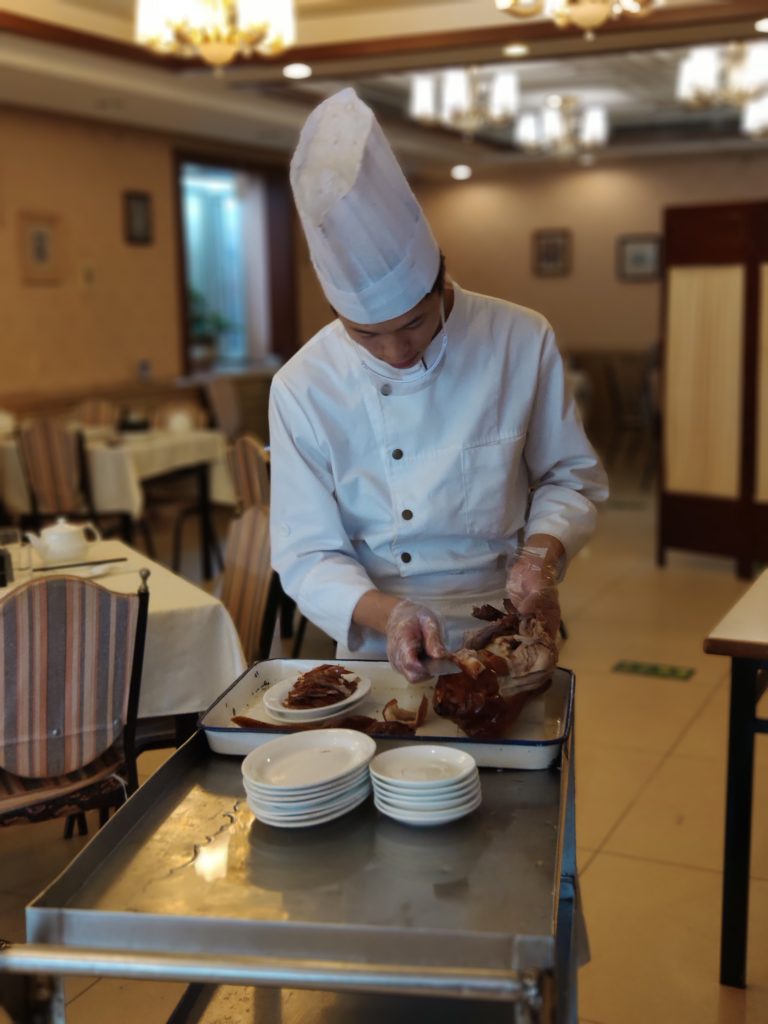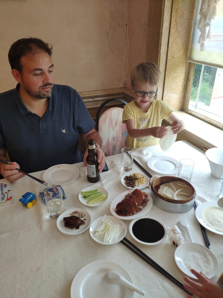 Nous sommes ensuite partis en route vers un restaurant typique où l’on sert du canard laqué. Cette adresse a été donnée à Vincent par un de ses collègues chinois. Nous n’avons pas été déçus car c’était délicieux. Les enfants se sont jetés sur les crêpes utilisées pour déguster le canard (on prend une crêpe, on badigeonne de sauce puis on ajoute concombre, oignon nouveau et Pickles et enfin le canard et on roule tout cela que l’on déguste) si bien que l’on a dû en recommander qui ont mis longtemps à arriver. On avait également pris des boulettes de riz frites que les enfants ont bien aimé.