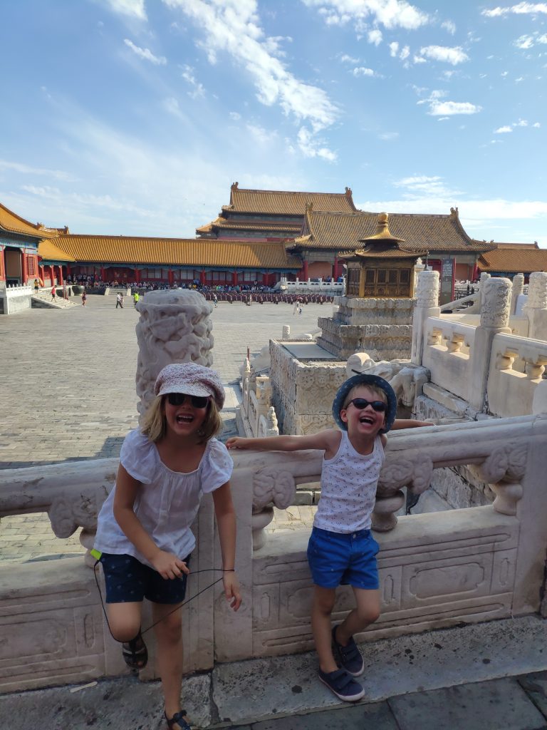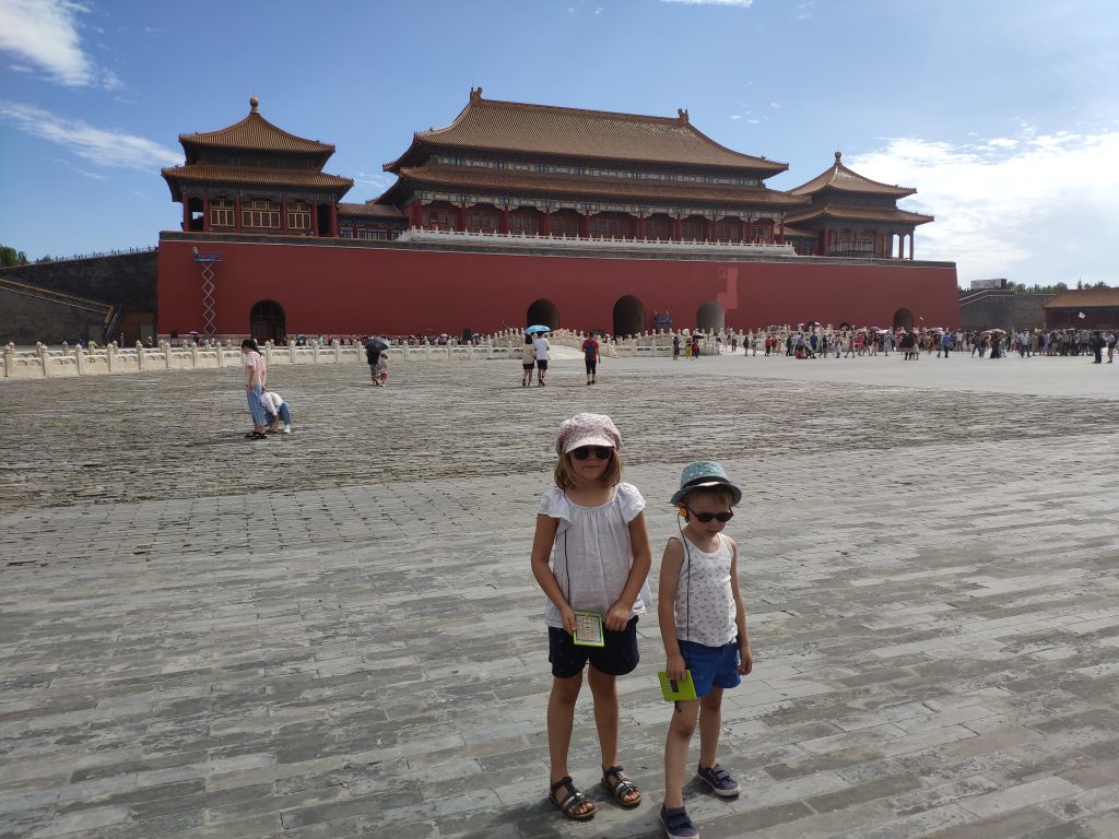 Après un ravitaillement plus que nécessaire en eau nous nous sommes dirigés vers les contrôles de tickets armés de mon téléphone avec notre e-ticket et nos passeports au cas où. Grande déception et 2eme agacement : la personne au guichet ne trouvait pas notre réservation. Aucun passeport ne passait. On a fait le forcing lui demandant à plusieurs reprises de réessayer sans succès. Finalement quelqu’un nous a amené à un bureau où a priori on pouvait acheter des billets (probablement sous certaines conditions puisque les billets du jour étaient sold out). Pas plus de succès et on était en plus pressés dans tous les sens par les gens derrière nous. On a appelé l’agence par laquelle on avait fait la réservation en ligne (ils ont commencé par nous dire que la résa avait été annulée…), que l’on a passé au téléphone à une personne du bureau de la cité interdite. Au final après avoir beaucoup insisté, une personne du bureau à réussi à nous réimprimer nos billets et nous avons pu passer. Mais on était agacés et fatigués après l’énergie dépensée pour réussir à entrer, les enfants n’en pouvaient plus et on avait perdu beaucoup de temps. On a vraiment trouvé que rien n’était fait pour faciliter l’accès aux touristes étrangers…