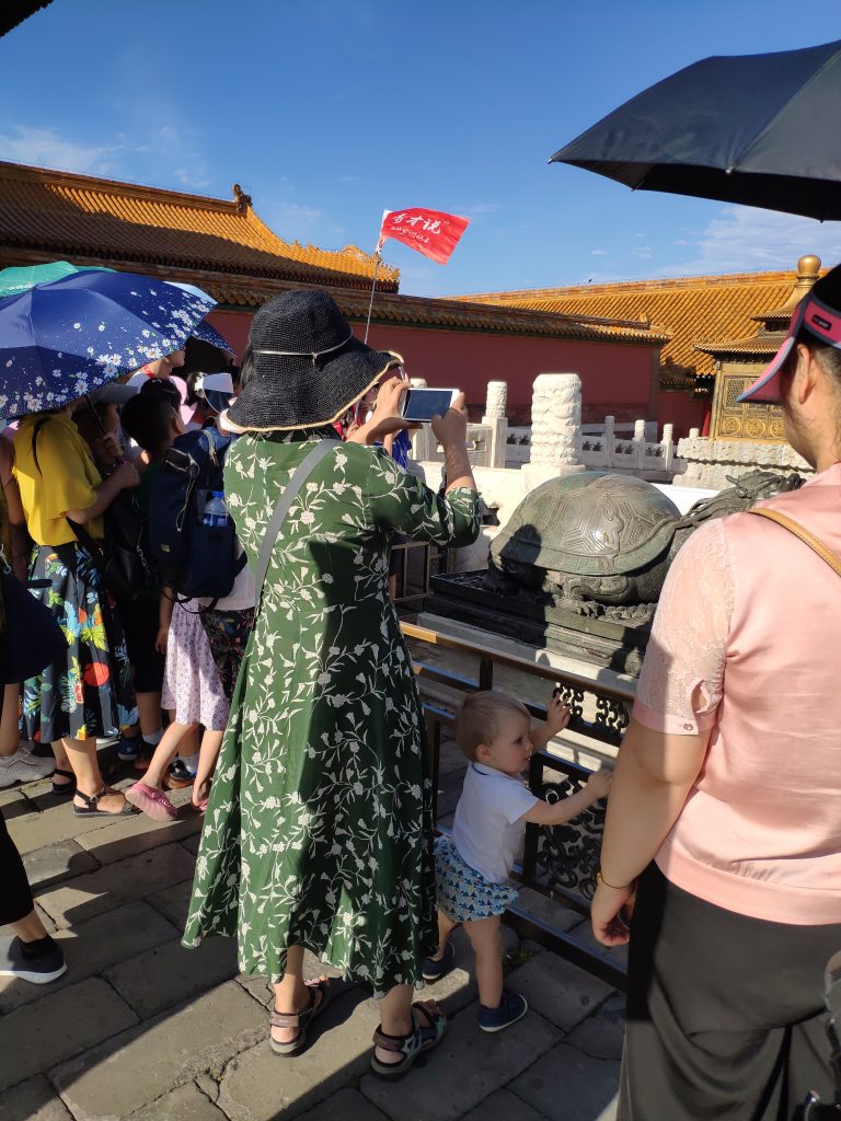 Une fois sortis des hutongs et après avoir affronté la foule de touristes en sens contraire et sous un soleil de plomb pour rejoindre la porte nord depuis la sortie des hutongs nous avons compris après plusieurs échanges avec des gardes que nous ne pouvions pas entrer par la porte nord, destinée uniquement à la sortie. Il fallait donc contourner la cité interdite (immense) pour rejoindre la porte sud. Premier agacement surtout que les enfants commençaient déjà à râler (fatigue de la veille + chaleur + faim/soif). On a finalement fait une pause pique-nique le long du mur, à l’ombre, histoire de reprendre quelques forces avant de longer la cité interdite parfois en plein soleil. Arrivés à la moitié nous avons pu prendre une petite navette qui nous a amenés à l’entrée. Les enfants ont bien aimé et nous aussi!