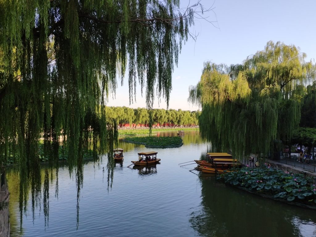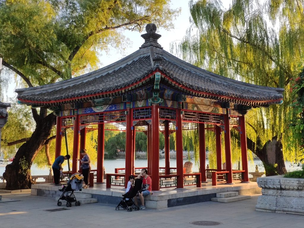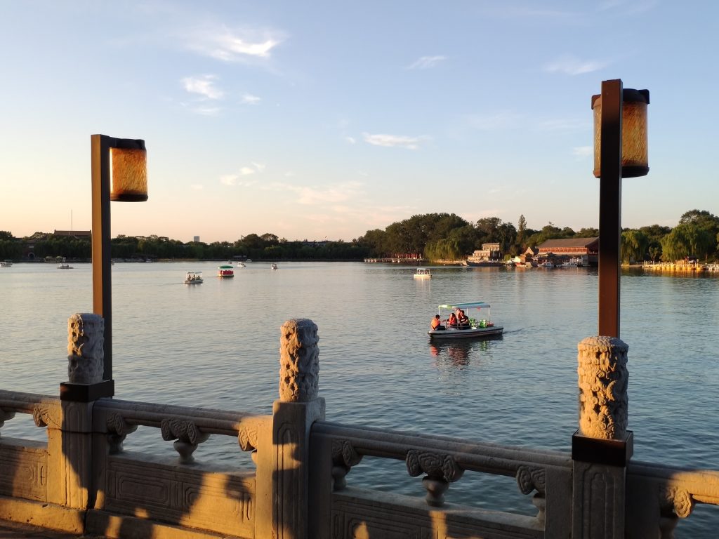 Après cette visite nous sommes allés dans le parc Beihai juste à côté de la cité interdite. Le parc était très agréable et la lumière de fin de journée magnifique. Nous avons fait une halte pour acheter quelques souvenirs. Nous avons essayé de faire un tour en bateau mais il était trop tard. Léonard complètement ko s’est endormi dans la poussette d’Auguste.