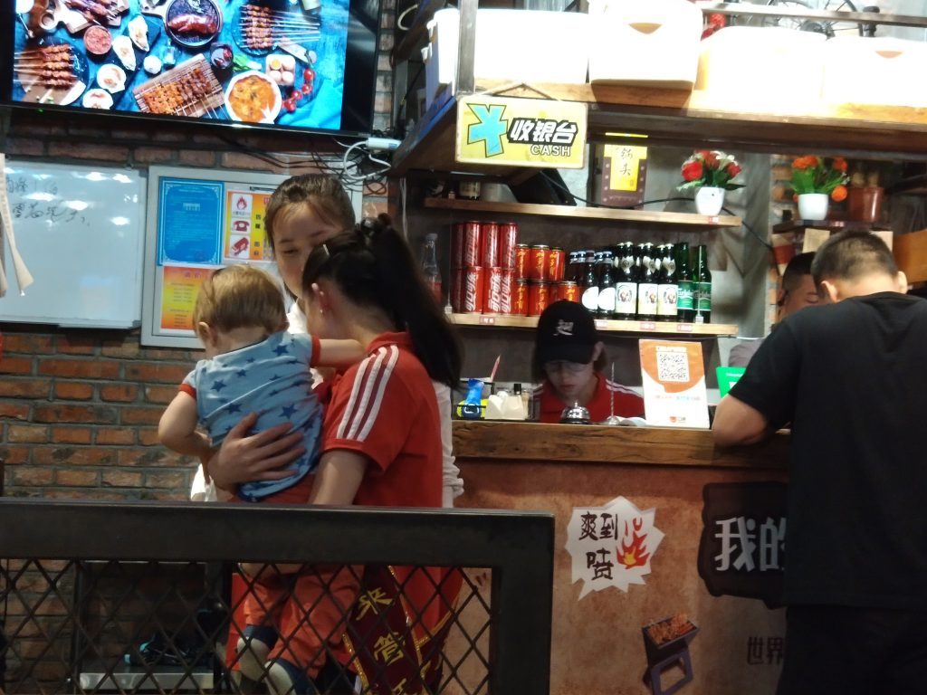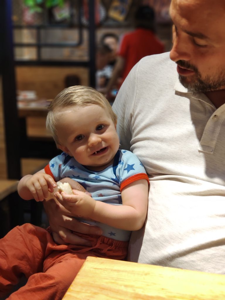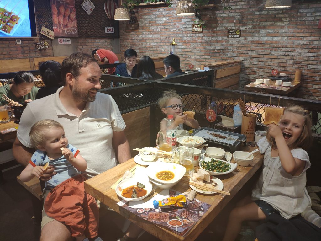 Nous avons ensuite dîné dans un resto de brochettes à la sortie du parc. Léonard avait repris du poil de la bête et a bien dévoré surtout les brochettes de pain (oui, oui, une tranche de pain de mie sur 2 pics). Auguste était le chouchou des serveurs et serveuses qui s’en sont occupés pendant que nous dînions. Nous avons goûté des œufs de 100 ans offerts par le restaurant. Pas si mal.