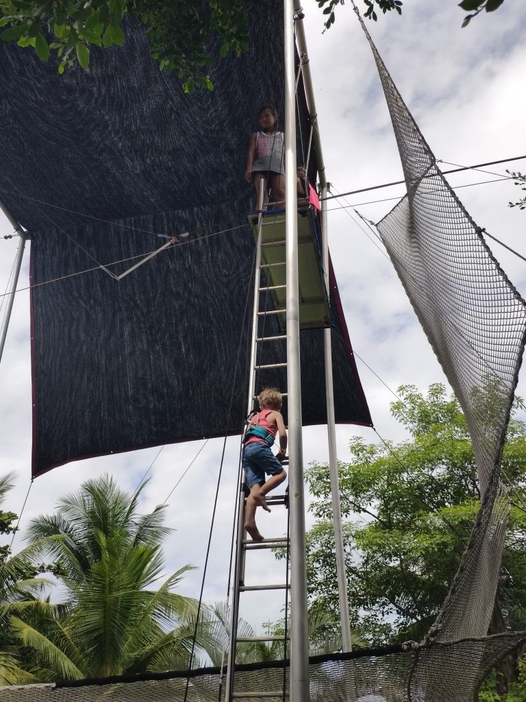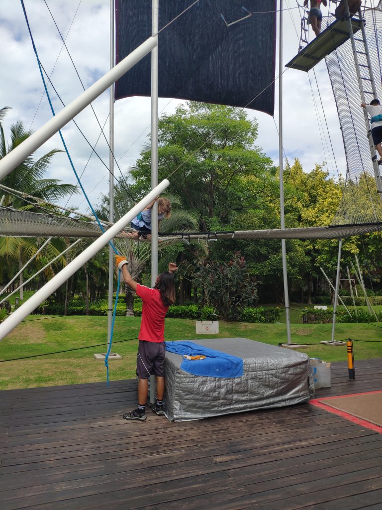 Ils ont commencé par du trapèze et n’ont pas du tout eu peur. 3 acrobates encadrent cette activité assez impressionnante pour des petits. Ensuite tir à l’arc et d’autres activités tout le long de la journée jusqu’à 17h. Nous leur avons fait un petit coucou vers 14h pendant leur séance piscine avec le mini clun et ils étaient ravis. Et piscine de nouveau après 17h où ils ont pu profiter des toboggans avec nous.