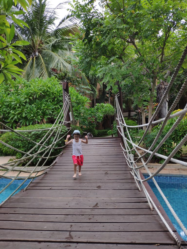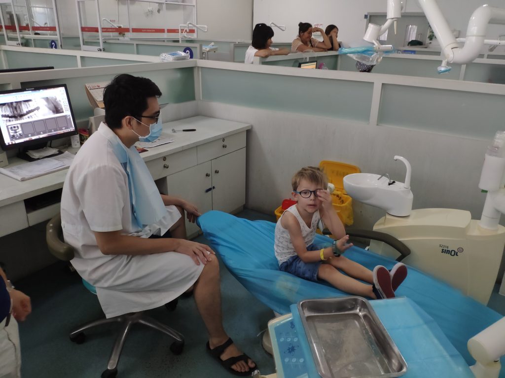 J’ai ma trousse de secours. Je désinfecte la plaie pas très jolie (peu profonde mais assez large avec la chair à vif — je vous épargne la photo) et pose des stéristrips (merci youtube pour le tuto) mais… qui ne tiennent pas longtemps car la blessure est placée à un endroit où la peau bouge beaucoup. On décide de se renseigner auprès des GO pendant le petit dej. On apprend qu’il y a une infirmerie. Et un des GO nous dit qu’il va envoyer un GO qui parle chinois/anglais pour qu’on se fasse comprendre de l’infirmière. Cela nous semble parfait. On y va après avoir déposé Valentine au mini club (qui retente le trapèze). L’infirmière re-desinfecte, regarde et nous fait comprendre qu’il vaut mieux recoudre. Je pars donc en taxi avec Léonard et un GO qui parle chinois/anglais pour nous aider sur place.