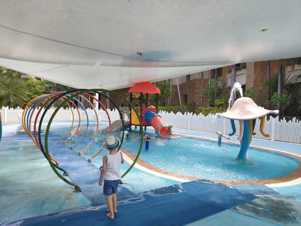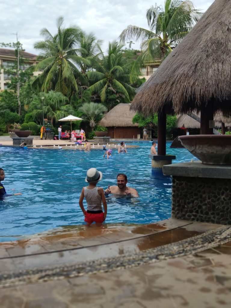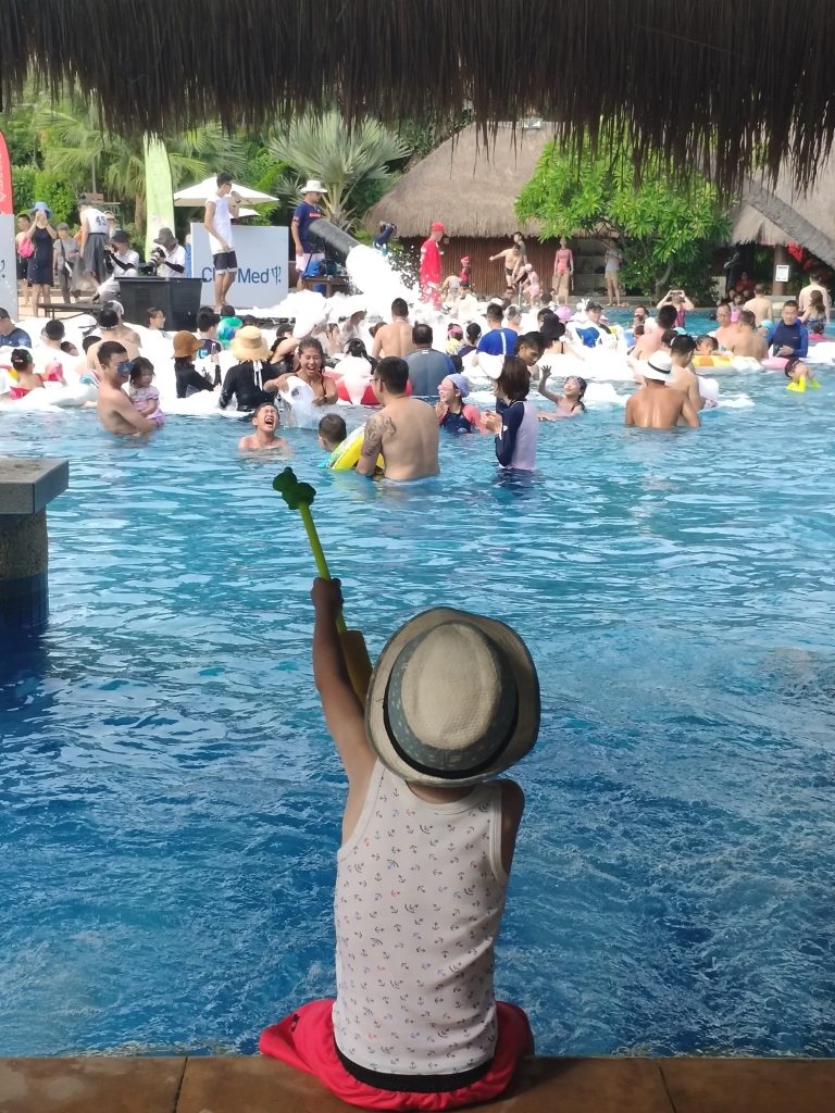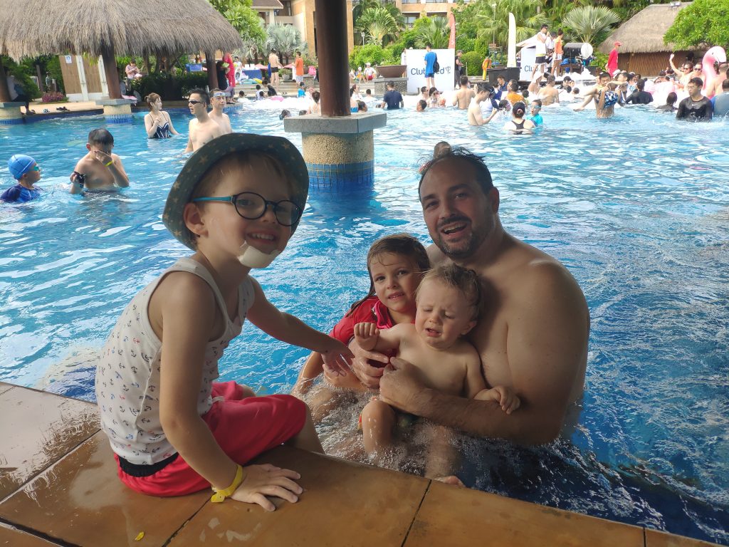 Après un dej rapide on emmène Auguste dans la petite piscine pour tout petit. Léonard qui n’a pas le droit de se baigner pendant 15 jours joue les pieds dans l’eau. A 16h on rejoint la grande piscine pour la Pool Party. C’est une fête hyper sympa avec musique, mousse, petit buffet. Les enfants s’eclatent et Léonard arrive à jouer sur le bord avec une sorte de pistolet à eau en mousse acheté la veille. La fête dure une petite heure mais on reste encore dans la piscine après. Valentine qui a retrouvé sa copine franco chinoise s’amuse beaucoup. Et Léonard continue de mettre juste les pieds dans l’eau (mais est un peu frustré). Auguste s’est endormi dans la poussette.