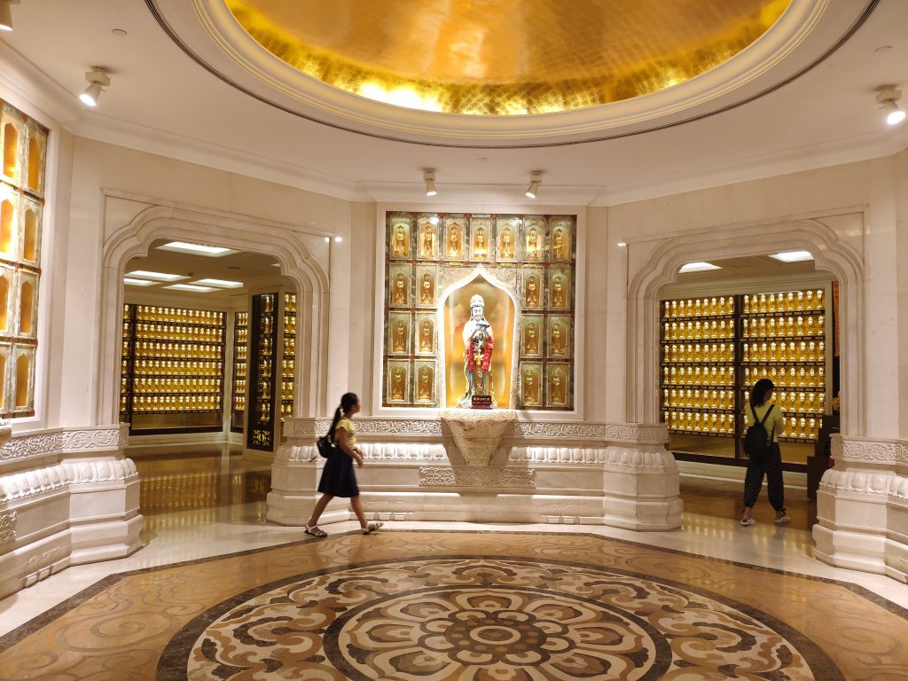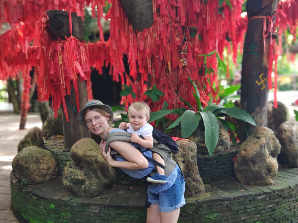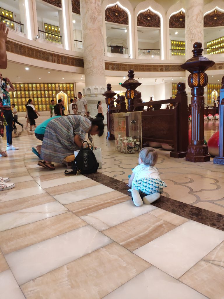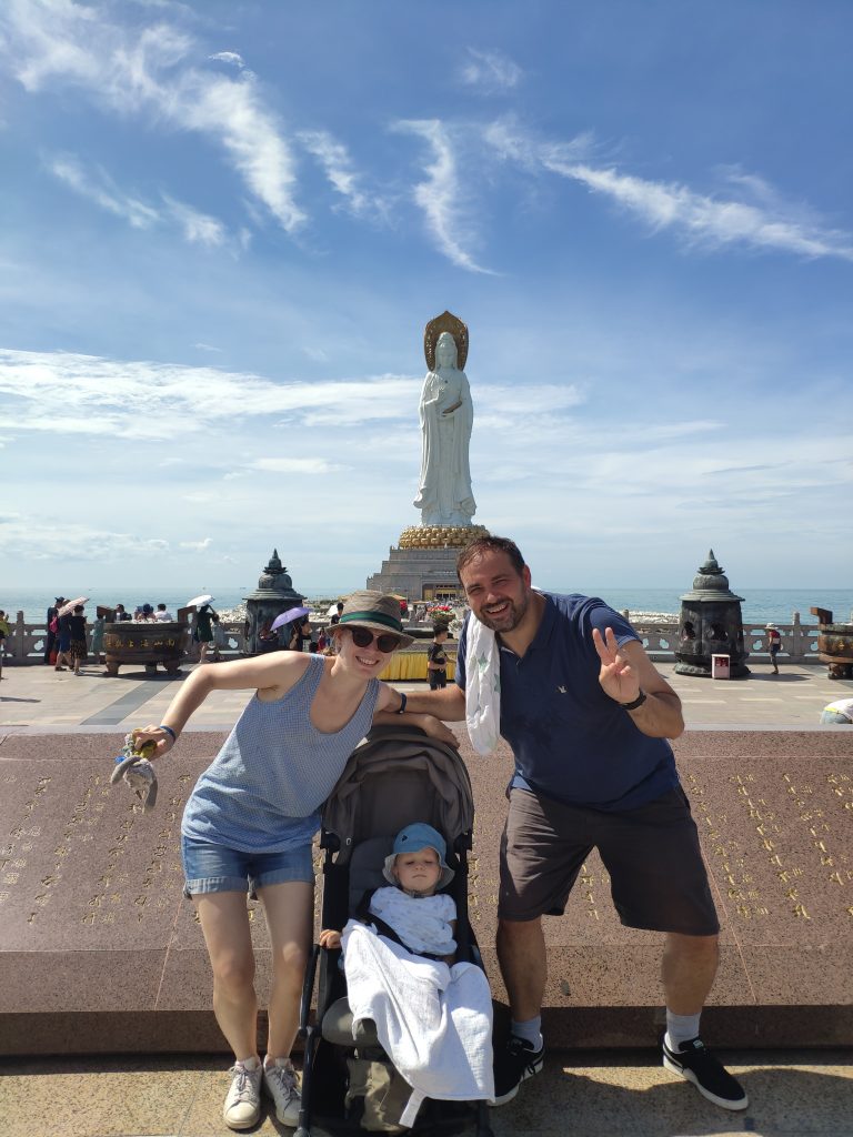 Nous avions un chauffeur à notre disposition pour nous conduire dans 2 lieux différents. Tout d’abord Nanshan Temple connu pour sa statue blanche de bouddha de 108 m se haut. Le chauffeur est venu avec nous pour acheter nos tickets puis nous a donné un peu plus de 2h de liberté pour la visite. Nous avons pris le petit train pour aller jusqu’au bouddha. Il faisait très beau et très chaud. On a cherché l’ombre pour aller jusqu’au bouddha. En rentrant à l’intérieur on s’est aperçu que c’était un bouddha garni (comme les œufs de Pâques) car il y avait plein de bouddhas à l’intérieur (c’était même la plus grande concentration de bouddhas que l’on ait vue!) Vincent est monté au niveau des pieds du grand bouddha pour avoir la vue qui était pas mal. On a ensuite repris le petit train pour rejoindre la sortie. Il y a avait d’autres arrêts possibles pour voir des petits temples mais nous n’avions pas le temps de nous y arrêter. Le voyage en petit train nous a permis de voir les jardins, avec une végétation de type jungle plutôt sympa.