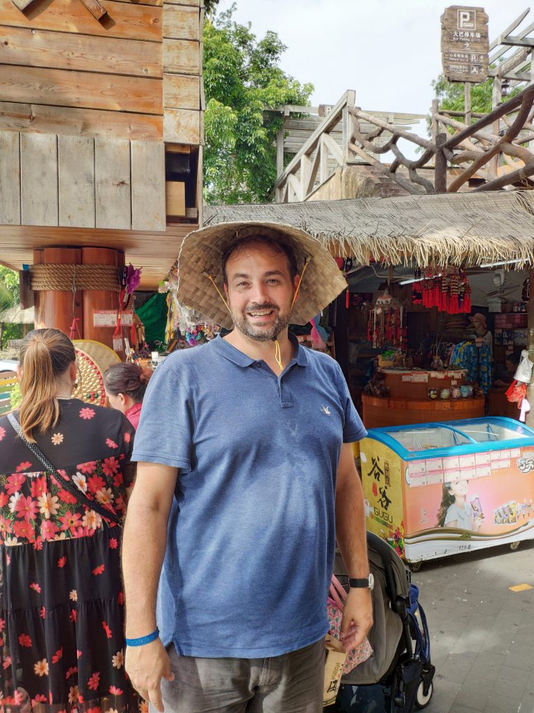 Après avoir retrouvé notre chauffeur nous avons repris la route direction Binglanggu qui est un parc à thème autour des civilisations Li Miao (encore appelé village des minorités). Notre chauffeur nous a une fois de plus aidé pour l’achat des tickets d’entrée et pour nous amener jusqu’au lieu du spectacle. Il fallait prendre une petite voiturette et s’arrêter au bon endroit ce que nous aurions eu du mal à faire nous même (surtout que nous étions pile à l’heure pour le début du spectacle). Nous avons donc commencé par assister à un spectacle nous présentant les traditions et rites des cultures Li et Miao ainsi que des danses et des jeux. Il y avait des cracheurs de feu et aussi des animaux (chèvres, oies…) Le spectacle était en extérieur et c’était très sympa. Bon, le public chinois, lui, n’est pas hyper cool: toujours à se lever ou à se mettre à genoux pour mieux voir sans se soucier de ceux qui sont derrière…