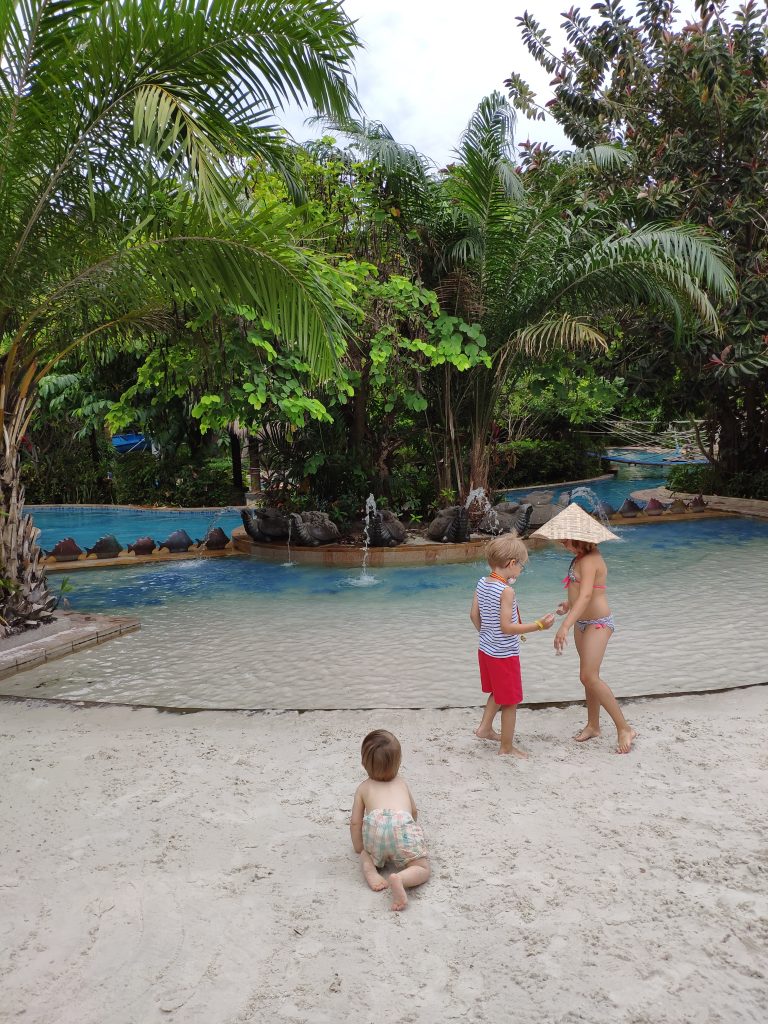Nous avons fini la journée à la piscine avec eux, sur la partie de la petite plage pour qu’Auguste puisse crapahuter et Léonard faire des châteaux de sable (i.e. la grande muraille en sable). Après l’apéro nous avons dîné au restaurant du club (et non au buffet — nous pouvions y réserver une table un soir). On est servis à table selon un menu mise en bouche / entrée / plat / dessert. Le chef (Vincent avait bien sympathisé avec lui) nous avait en plus mis de côté un plateau de fruits de mer (gambas, langouste, moule, Saint-Jacques). On a très bien mangé et on en pouvait plus!