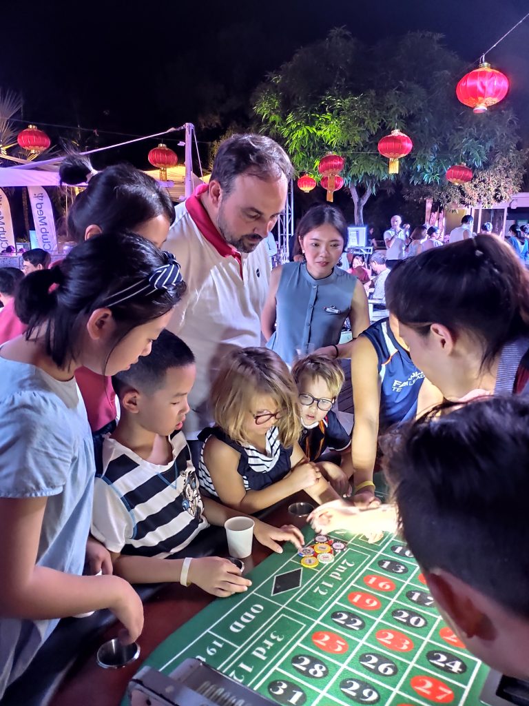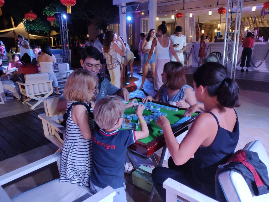 On a loupé le spectacle mais participé à la dernière soirée : Casino ! Les enfants ont joué à la roulette pendant que je jouais au mah jong avec des chinois qui étaient impressionnés que je connaisse les règles. J’ai un peu galéré à la première partie avec les chiffres qui n’étaient indiqués qu’en chinois. Puis j’ai demandé qu’on les mette dans l’ordre et j’ai photographié la série pour les parties suivantes. Cela m’a bien aidé. Les règles étaient un peu différentes de celles auxquelles je joue habituellement mais j’ai réussi à me débrouiller. Après la soirée, opération bagages une fois les enfants endormis.